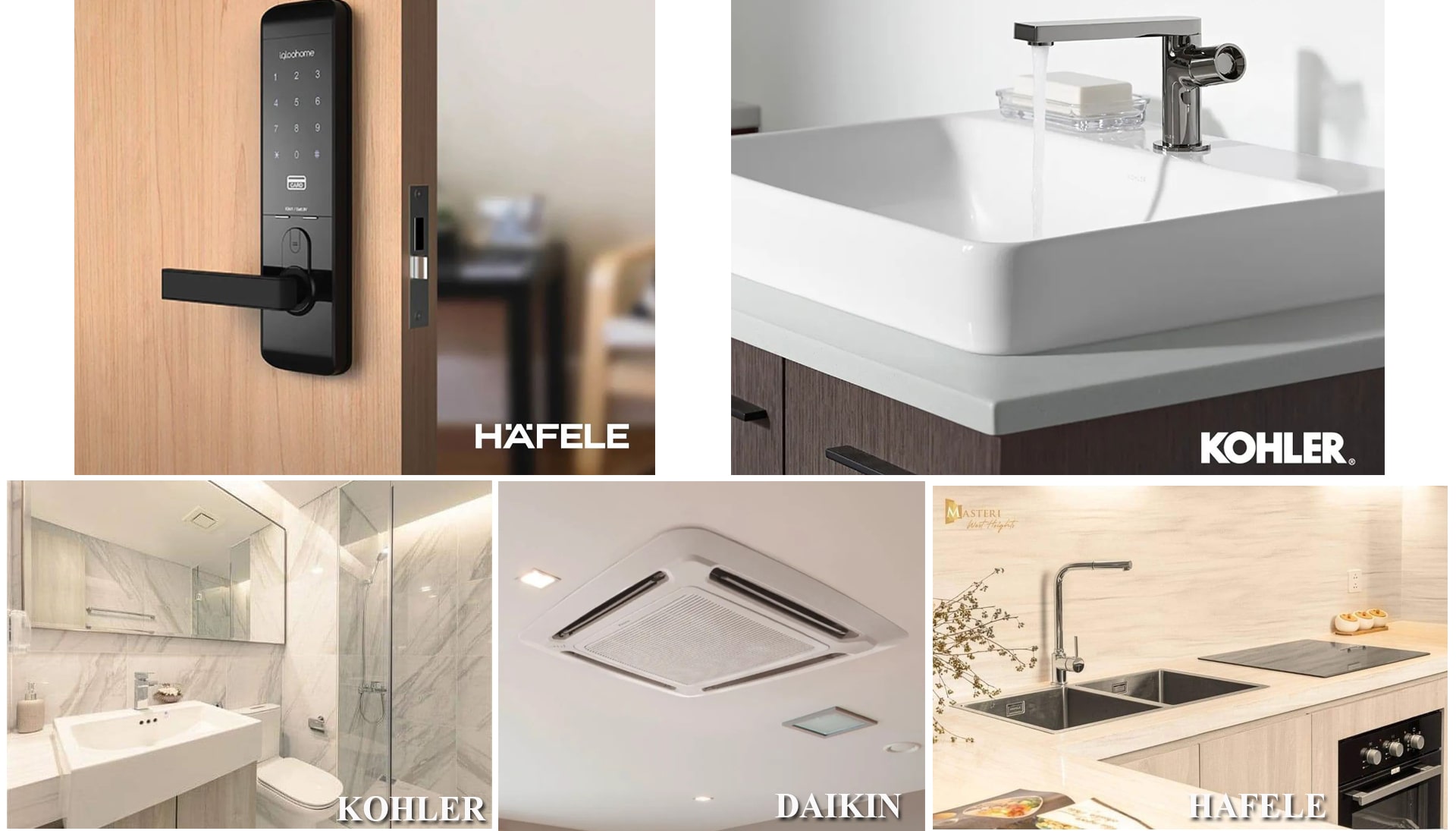 Chủ đầu tư rất chú ý chi tiết, thiết kế đồng bộ xứng tầm với căn hộ hạng A. Căn hộ masteri West Heights được sử dụng thương hiệu Hafelee cho khóa cửa chống cháy, bếp từ và lò nướng, chậu rửa bát. Trong khi đó, khu vệ sinh sử dụng thiết bị Kohler, điều hòa Daikin…